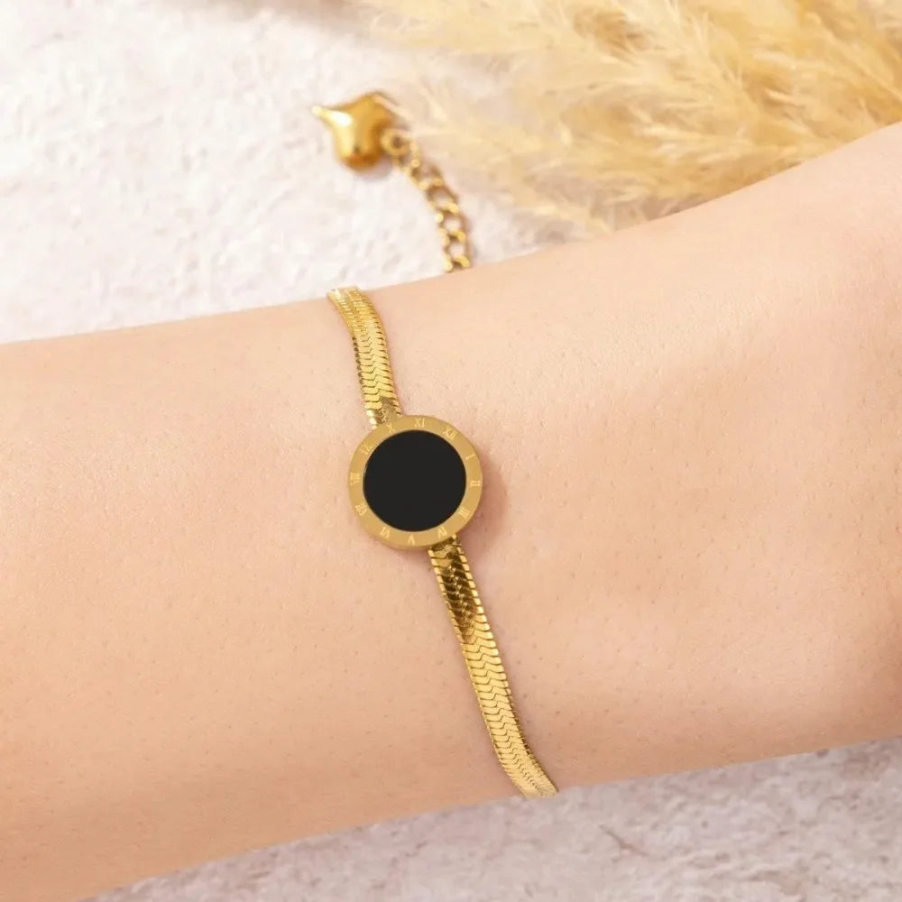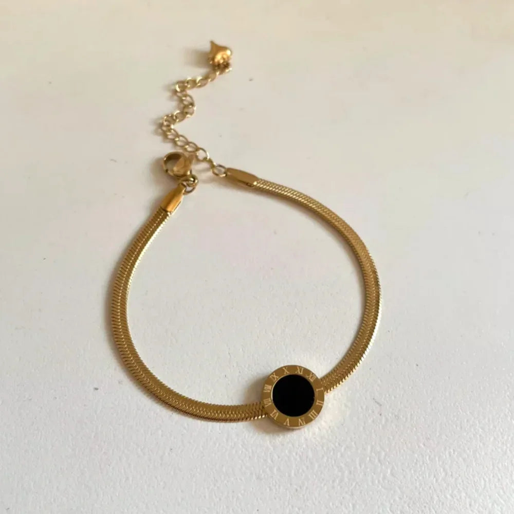 Embrace vintage elegance with Lotta✨, a minimalist flat snake chain bracelet featuring black Roman numerals. Crafted from stainless steel with an 18K gold-plated finish, this hypoallergenic and water-resistant bracelet offers timeless style and durability. Perfect for daily wear, parties, or gifting, Lotta✨ combines classic design with modern sophistication for a chic, versatile look.