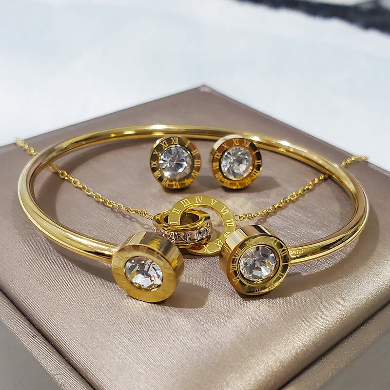 Elevate your elegance with Maila✨, featuring a necklace, bracelet, and stud earrings inspired by Roman numeral designs. Crafted from 316L stainless steel with gold, silver, or rose-gold tones and sparkling AAA cubic zirconia, this set is perfect for parties, engagements, or gifting. Durable, hypoallergenic, and versatile, Maila✨ adds timeless sophistication and a modern touch to any outfit.