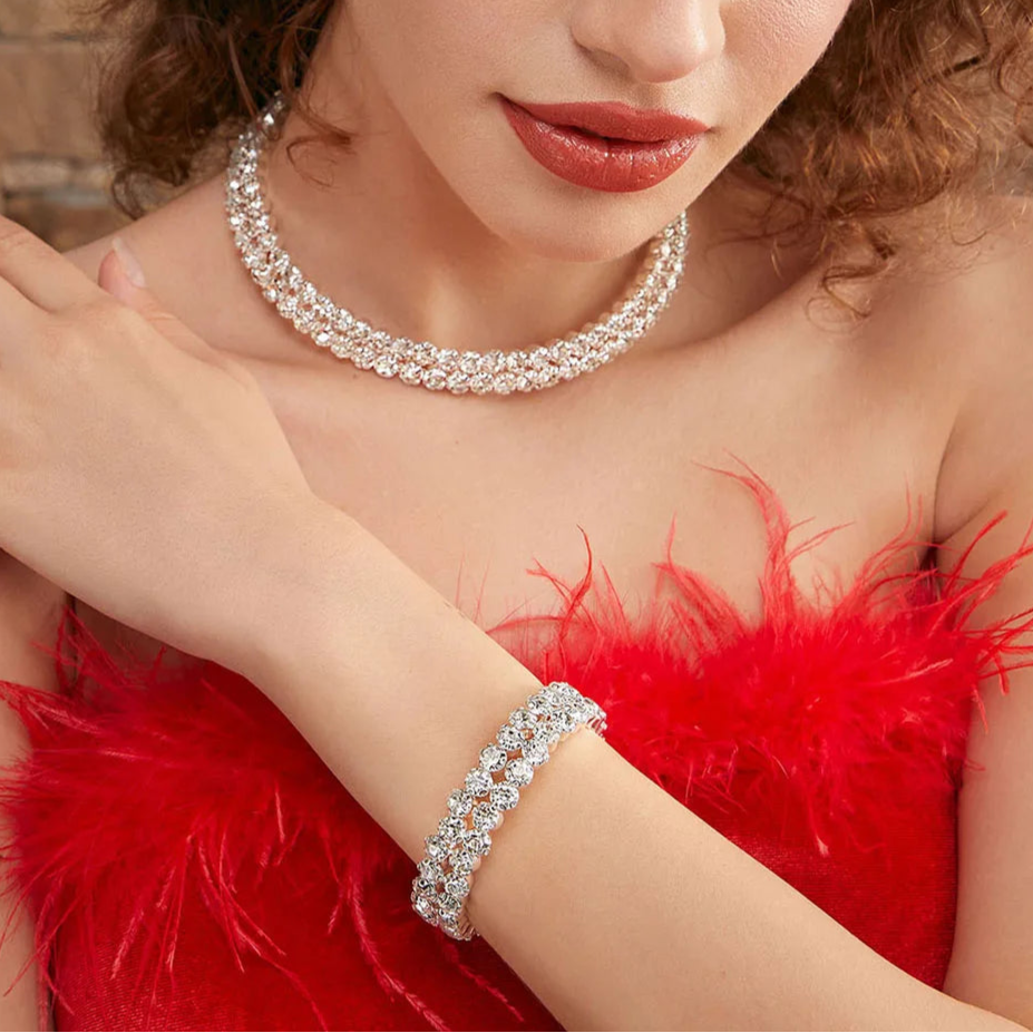 Shine on your special day with Ritva✨, a luxurious bridal collection featuring a gold-tone crystal choker, matching earrings, and bracelet. Adorned with sparkling rhinestones, this elegant set is perfect for weddings, anniversaries, or formal parties. Hypoallergenic and timeless, Ritva✨ adds a radiant and sophisticated touch to any bridal or festive outfit.