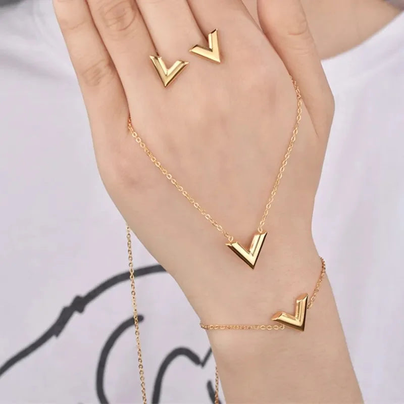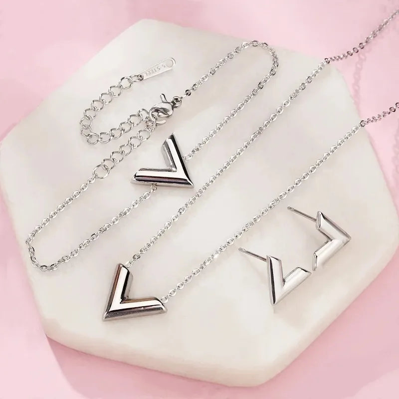 Enhance your look with Virpi✨, featuring a sleek V-shaped design across a stainless steel necklace, bracelet, and earrings. This minimalist set combines elegance with a modern, fashionable edge, perfect for parties, casual outings, or gifting. Virpi✨ is versatile, durable, and designed to complement any outfit with a subtle yet striking statement.